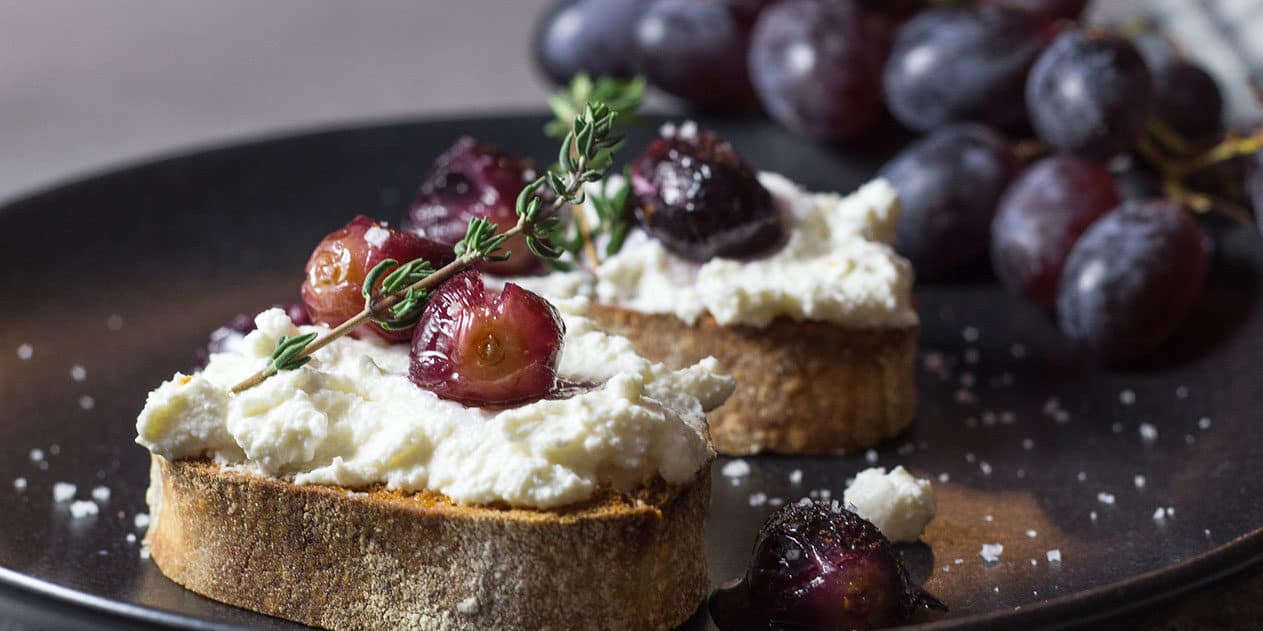 Bruschetta mit Ricotta und gebackenen Thymian-Weintrauben