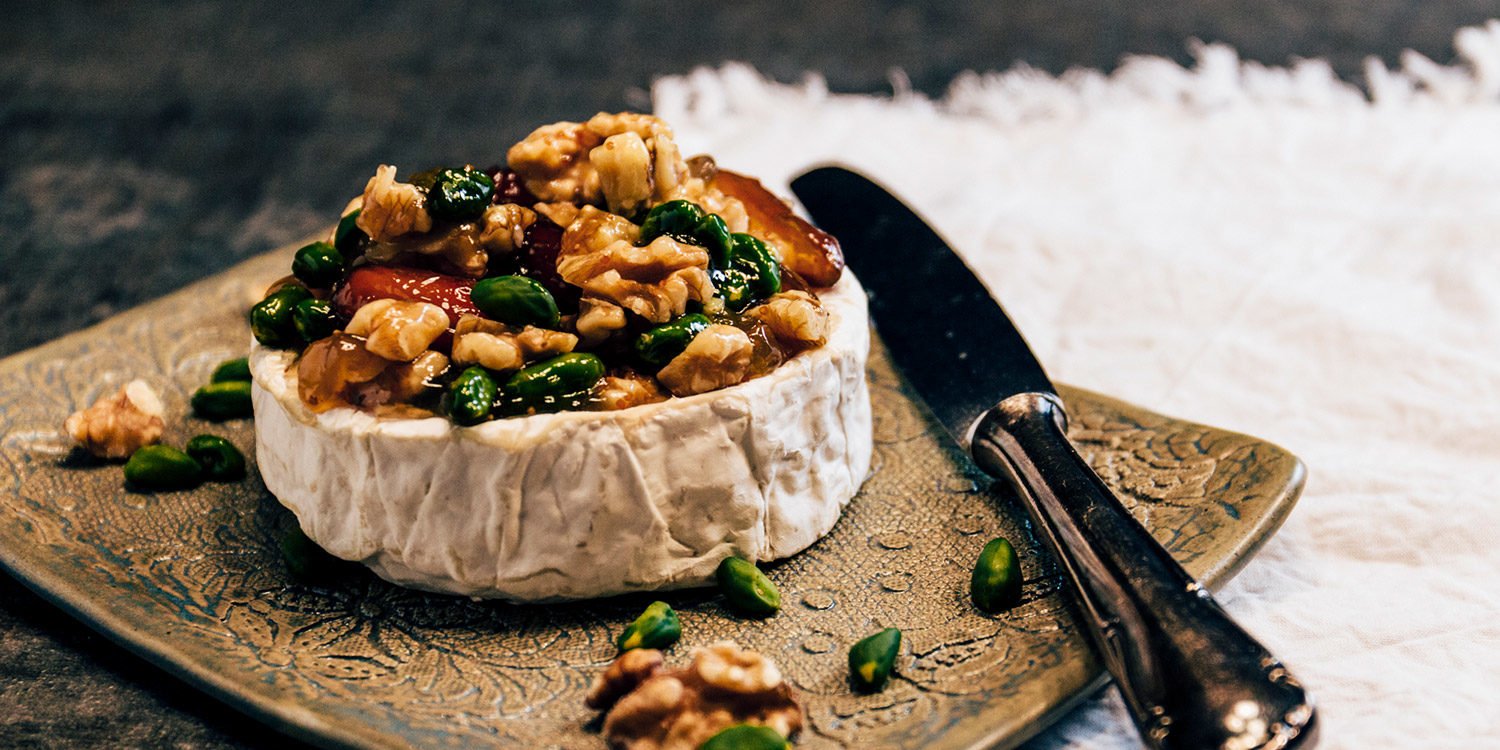 Gebackener Camembert mit Datteln, Walnüssen und Pistazien