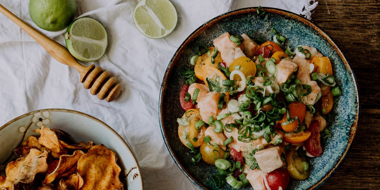 Lomi Lomi ist eine traditionelle hawaiianische Vorspeise aus frischem Lachsfilet, Limettensaft, Honig und Gemüse nach Wahl. Auf meiner Lieblingsinsel Maui wird Lomi Lomi auf großen Bananenblättern serviert und mit Frangipani oder Hibiskus dekoriert. Das kann ich Dir heute leider nicht bieten, doch auch so schmeckt der hawaiianische Lachssalat mit Süßkartoffelchips köstlich.
