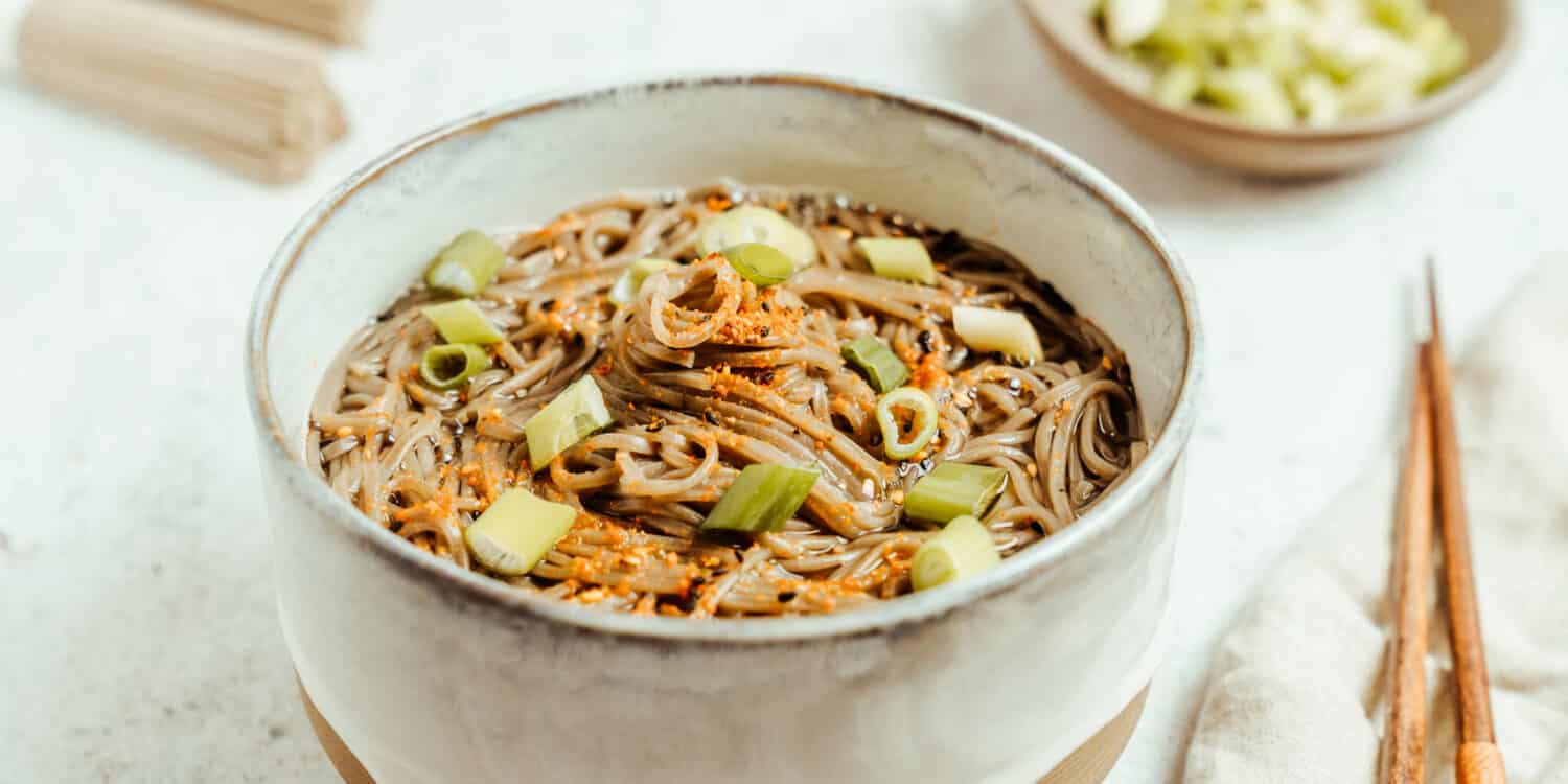 Rezepte für japanische Nudelsuppen gibt es unzählige – eigentlich gibt es Rezepte für japanische Nudelsuppen für jeden Tag. Ein schnelles und einfaches vegetarisches Soba Nudelsuppe Rezept, nämlich für Kake Soba, findest Du im Folgenden. Kake Soba, eine Suppe mit japanischen Buchweizennudeln, einer Brühe aus Dashi, Sojasauce, Mirin und Sake, Frühlingszwiebeln und der japanischen Gewürzmischung Shichimi Togarashi lässt sich in nur 15 Minuten ganz easy zubereiten und schmeckt einfach herrlich.